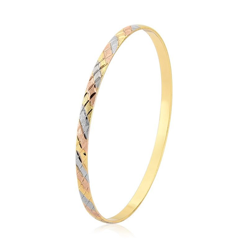 O bracelete redondo é uma joia encantadora que destaca a beleza do acabamento diamantado com detalhes em faixas de três tons metálicos, ouro amarelo, branco e rose. Com um toque moderno e delicado, ele é ideal para compor produções elegantes sem exageros. Seu design traz uma faixa em textura xadrez, na parte de cima, onde se misturam os tons dourado, o rosé e o branco em harmonia sutil, e a parte de baixo é lisa destacando o brilho do ouro. É uma peça que valoriza o visual com leveza e muito bom gosto.