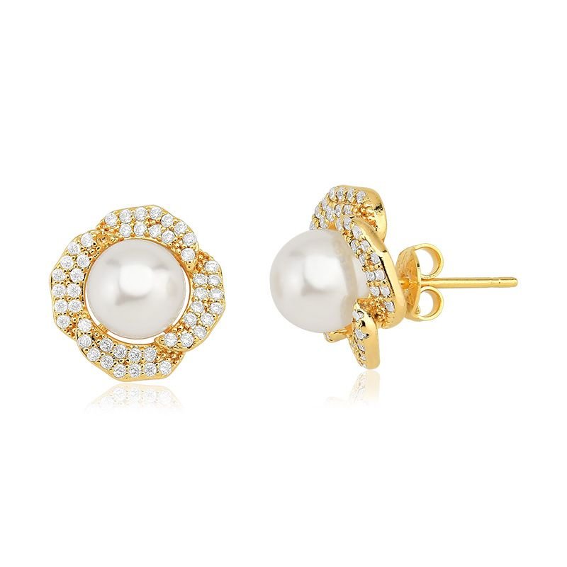 O brinco de pérola design flor folheado a ouro 18k é uma joia pequena e encantadora. Possui pérola de 7mm no centro e microzircônias cravejadas ao redor, que proporcionam brilho sofisticado.