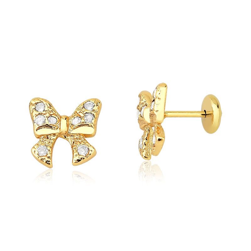 Produzido com folheado a ouro 18k e camada de verniz protetor, o brinco infantil laço mantém brilho e resistência prolongados. Conta com garantia vitalícia do banho e 6 meses contra defeitos de fabricação, oferecendo segurança e durabilidade. Uma peça feita para encantar e durar por muito tempo.