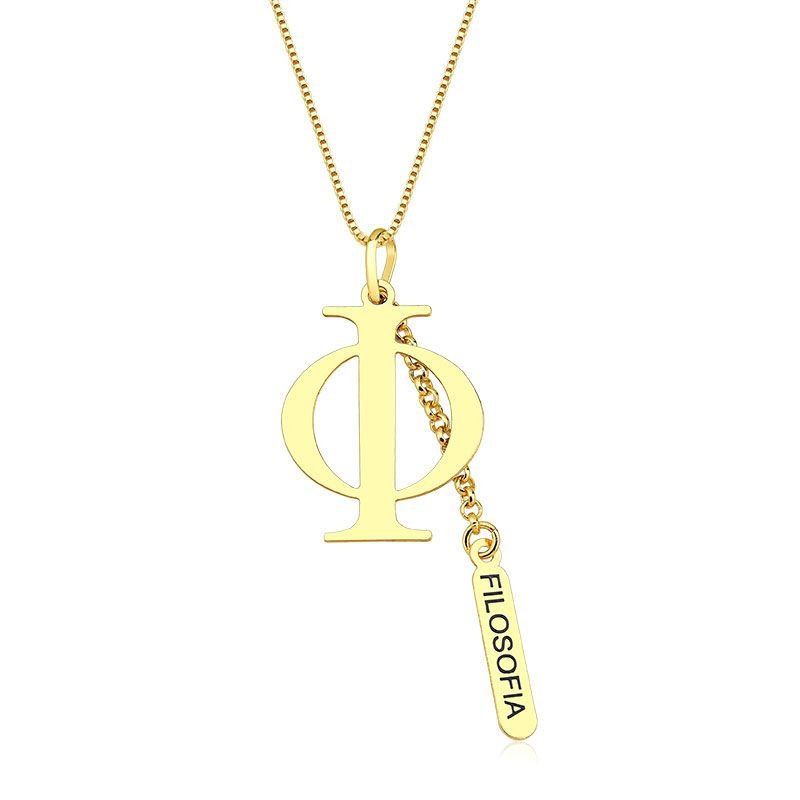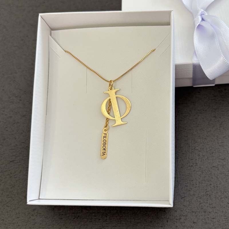 Produzido com folheação em ouro 18k, o colar conta com corrente veneziana fina, pingente com o símbolo da Filosofia e plaquinha com o nome da profissão. Um acessório sofisticado, durável e cheio de significado, perfeito para o uso diário ou para presentear alguém especial.