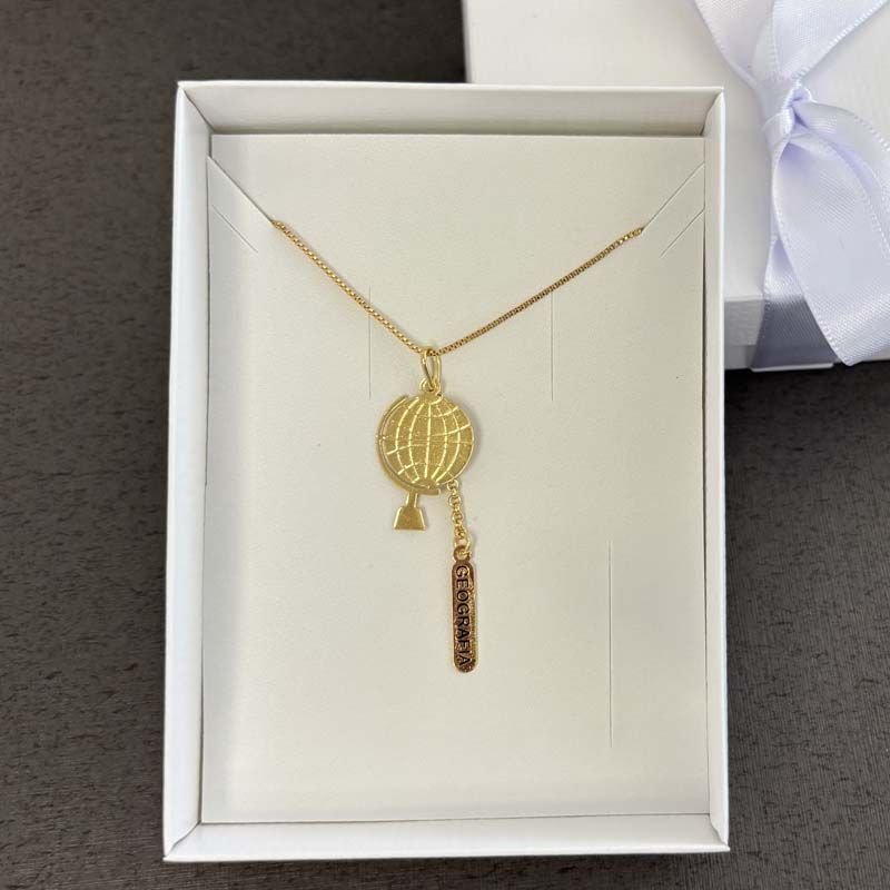 O colar de profissão Geografia folheado a ouro pode ser usado sozinho, para um visual minimalista e delicado, ou combinado com outros colares de diferentes comprimentos, criando o efeito de mix de colares que está em alta. Combine-o com brincos pequenos ou argolinhas douradas para um look sofisticado e equilibrado. É também uma excelente escolha para presentear quem ama o universo da Geografia ou acaba de se formar.