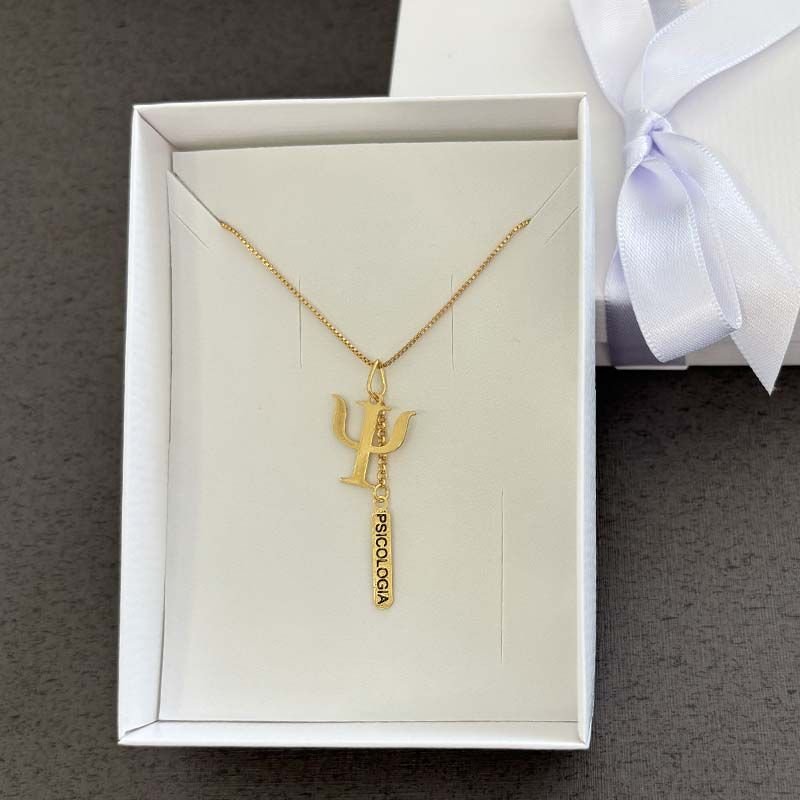 Composto por uma delicada corrente veneziana e dois pingentes — um com o nome da profissão e outro com o símbolo da Psicologia —, o colar é folheado a ouro 18k e possui acabamento impecável. É uma peça que transmite elegância e identidade em cada detalhe.