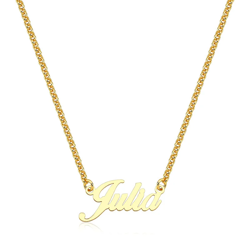 Esse colar com nome em fonte itálica fica perfeito quando usado sozinho, valorizando o desenho do nome e a delicadeza da corrente portuguesa.