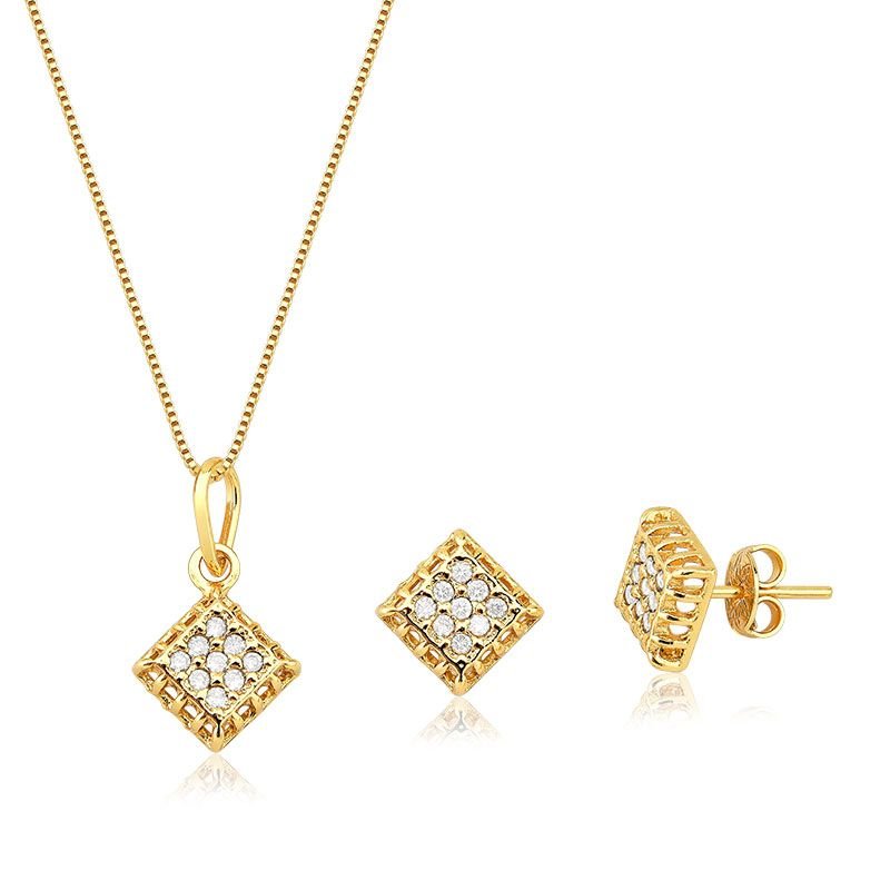 O conjunto colar e brincos quadrado folheado a ouro 18k é a escolha perfeita para quem busca sofisticação em cada detalhe. Com design moderno e delicado, ele combina pingente e brincos quadrados, vazados e cravejados com microzircônias, transmitindo elegância em qualquer ocasião. Também tem uma corrente veneziana fina, para compor o colar com o pingente.