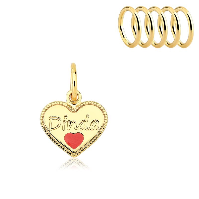 Nosso pingente Dinda, folheado a ouro 18k, tem formato de coração com detalhe esmaltado vermelho e a palavra “Dinda” gravada. Ideal para montar em pulseiras e presentear a madrinha com muito carinho.