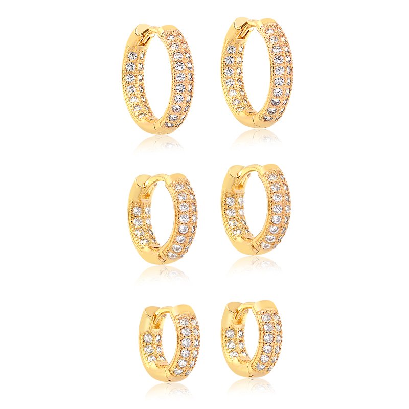 Trio de argolas cravejado de microzircônias folheado a ouro 18k. Esse trio de argolas é muito lindo e glamoroso! Argolas estão sempre na moda, e são os queridinhos do momento. Sem falar que são lindos demais! Esses brincos de argola são cravejados em microzircônias, por dentro e por fora e banhados em ouro, o que dá um destaque especial à peça, um brilho único e muito glamour. Proporcionando uma visibilidade incomparável a seu look. Perfeito para realizar composições encantadoras folheadas em ouro. Se preferir, combine com outros modelinhos de brincos ou piercings para ter o mix ideal. Você vai se apaixonar! Não perca a oportunidade de brilhar. Use a abuse! Seja o seu próprio brillo! Encontre esse e outros modelos de brincos de argolas disponíveis no site da Maise Joias.